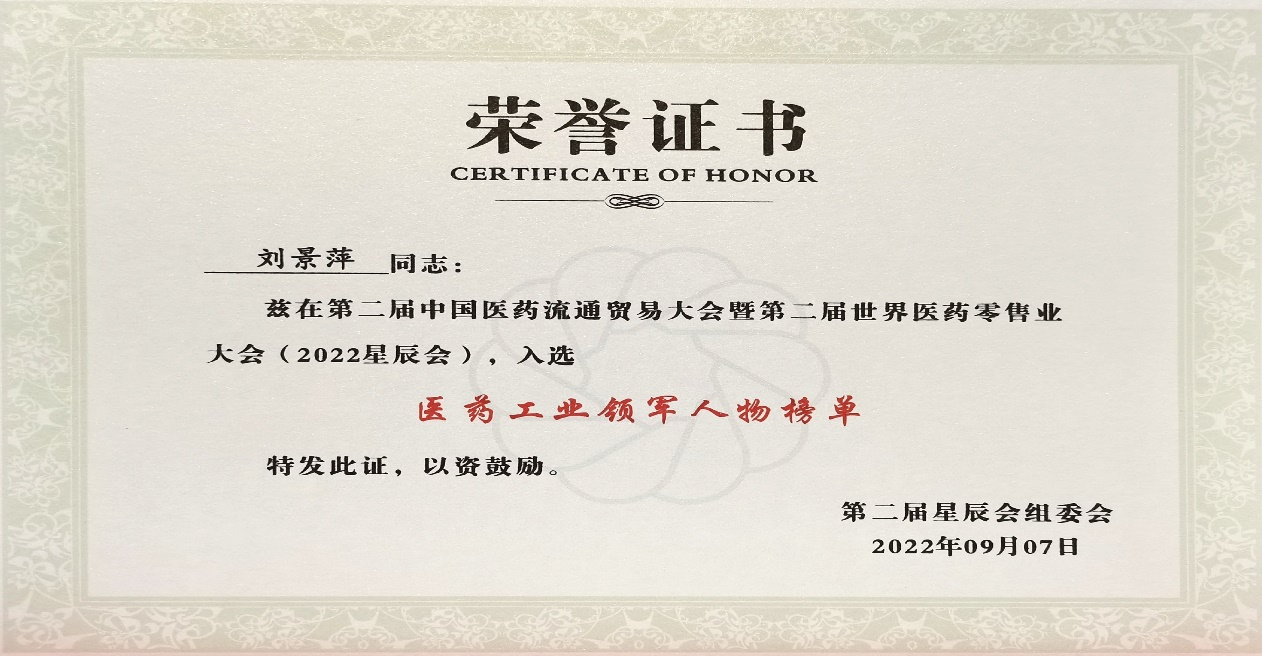 本次星辰会期间,Z6·尊龙凯时斩获颇丰,获得多项行业奖项及荣誉。在开幕式上,刘景萍董事长荣获“医药工业领军人物”称号。